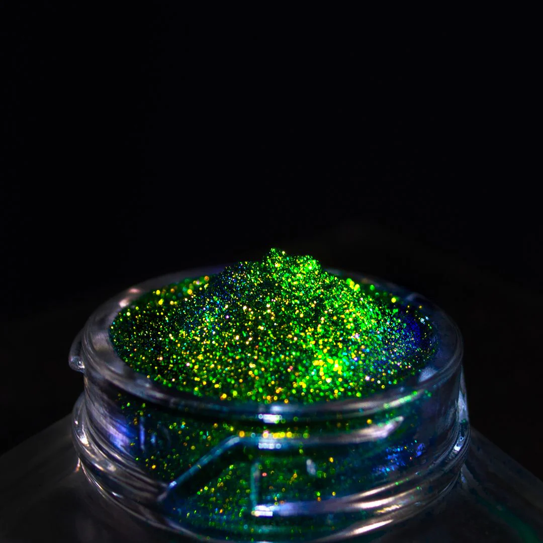 Introducing "Jungle Mirage," a stunning multichrome eyeshadow pigment shade that effortlessly transitions from a warm gold, reminiscent of a tropical rainforests' florals, to a vibrant bright green, capturing the lively energy of lush vegetation, and finally to a tranquil blue, evoking the serene beauty of a hidden jungle waterfall. Experience this harmonious blend of colours and let your eyes radiate with natural beauty and captivating freshness.